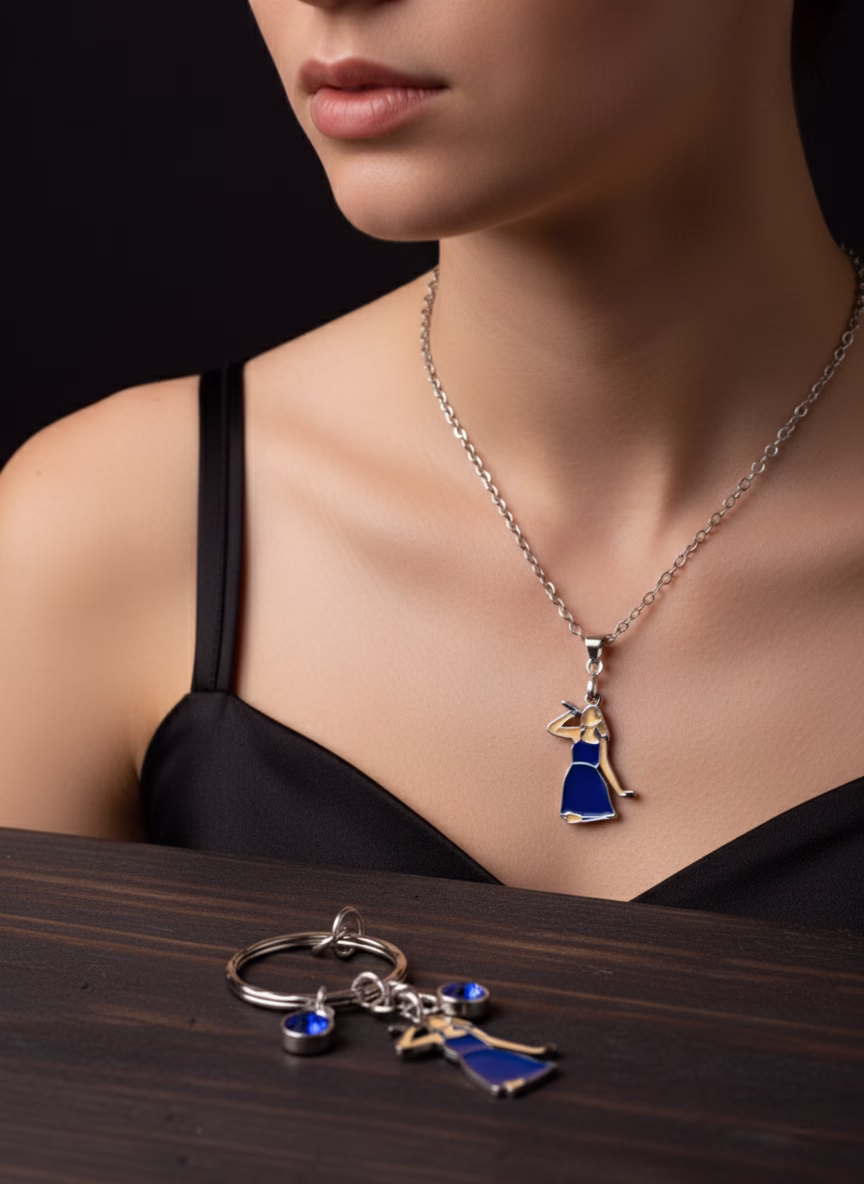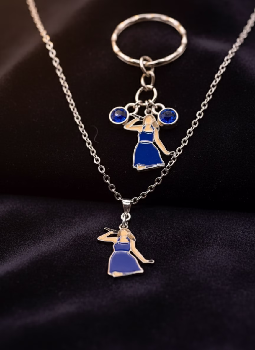 Sleek and luminous, the Blue Midnights era inspired necklace and keyring set captures late-night sparkle in resin and steel.